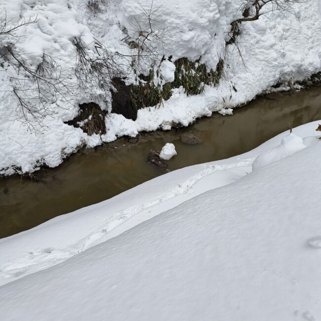 先へ進んでいくと鹿が川に入っていく足跡があった。